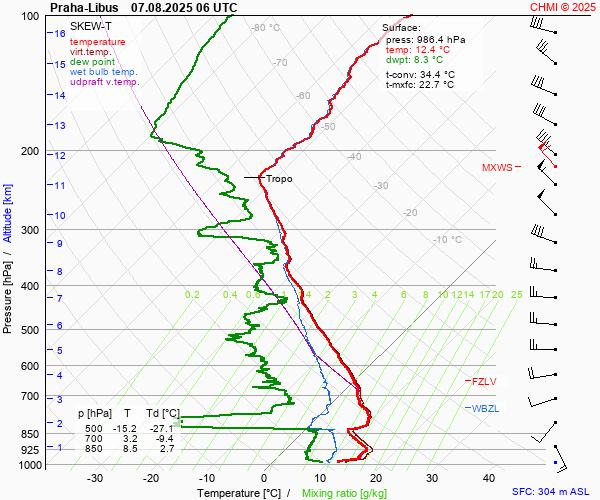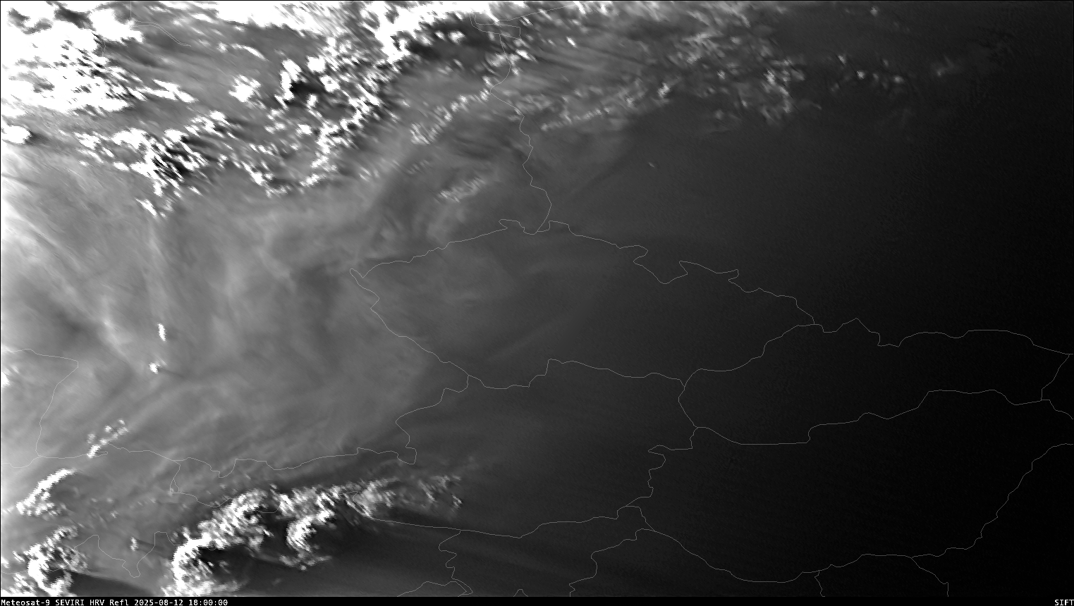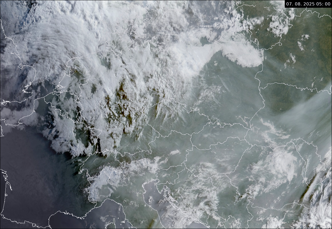 Samsung NX 500 & Samyang 8mm F2.8 UMC Fisheye II, interval 5 seconds, speed 150x 20250807_0419-0824utc_Kacerov_cirrus-in-B&W_x264_1800x1080.mp4 (208 MB) Cirrus clouds in 256 shades of gray. The high variability and diversity of cirrus clouds over a four-hour period was most likely related to the presence of large amounts of smoke from Canadian fires over Central Europe. Smoke particles act as condensation or crystallization nuclei; given their altitude in this case of up to 12 km, they act as cirrus cloud nuclei. This is clearly visible in the ALC profiles (Automatic Lidar Ceilometers), available, for example, from the EUMETNET e-Profile network. The extent of the smoke from the fires is then highlighted in satellite images from the MTG satellite and its FCI instrument, in the RGB TrueColor product. It uses short-wave channels VIS04, VIS05, and VIS06, which are significantly more sensitive to the presence of aerosols (smoke, dust from fires or volcanic eruptions, pollen, small salt crystals, or small droplets) than other FCI channels operating at longer wavelengths. Dust layers are particularly prominent when illuminated by the Sun low above the horizon. Transport of the dust from Canada fires across the Atlantic Ocean to Europe is clearly visible in the animation of aerosol products (dark red) from MODIS and VIIRS instruments. In black and white, the 3D structure and dynamics of cirrus clouds also stand out much better, resulting from different motion of cirrus layers depending on their height and wind profile, seen in the sounding from Praha-Libuš station taken on this morning.
