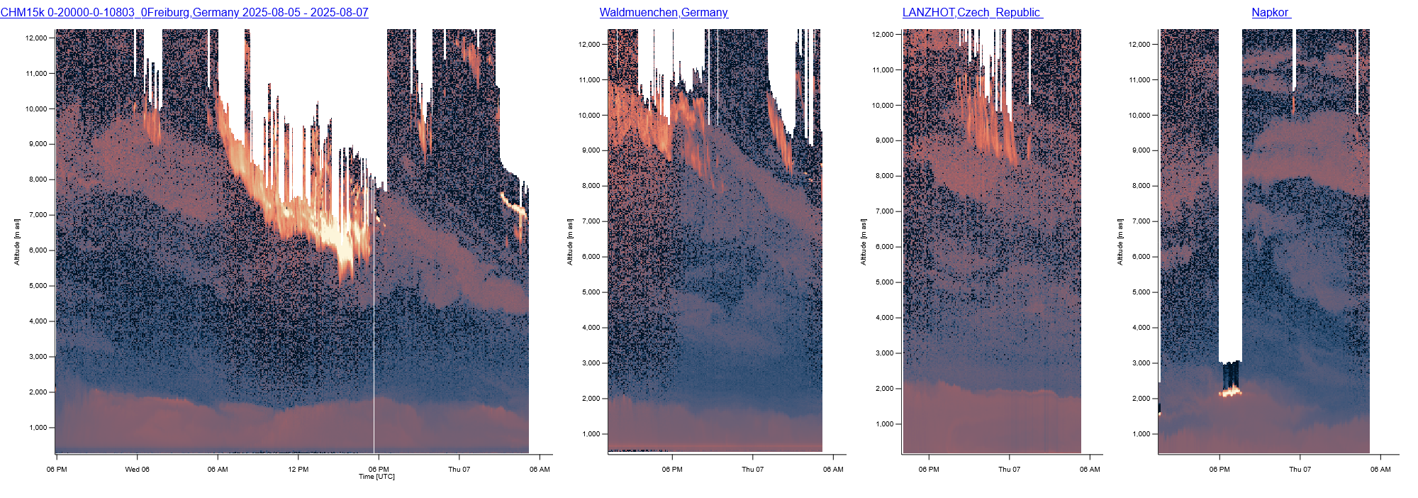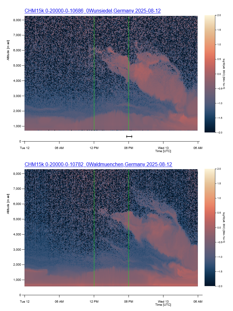 In images from meteorological satellites, dust clouds are typically best seen either early morning, shortly after sunrise, or in the late afternoon, before sunset – see the animation of images from MTG-I1 (Meteosat Third Generation) in the RGB TrueColor product (12-18 UTC). These dust clouds stand out even better in images taken by Meteosat-9, which is located above the western Indian Ocean and thus "looks" at the dust over Europe almost against the setting sun, resulting in strong forward scattering of light on the dust particles. See also the last image from this satellite from 18:00 UTC (slightly more enhanced). Finally, the vertical structure of the dust is clearly visible in the time slice from ALC lidars over Germany, near Czechia western border. In it, the green vertical lines define the interval of the animation from MTG-I1, and the double arrow indicates the timelapse interval (the reason for using these two German lidars is their significantly better quality compared to our older lidars). ALC source: EUMETNET eProfile. |
