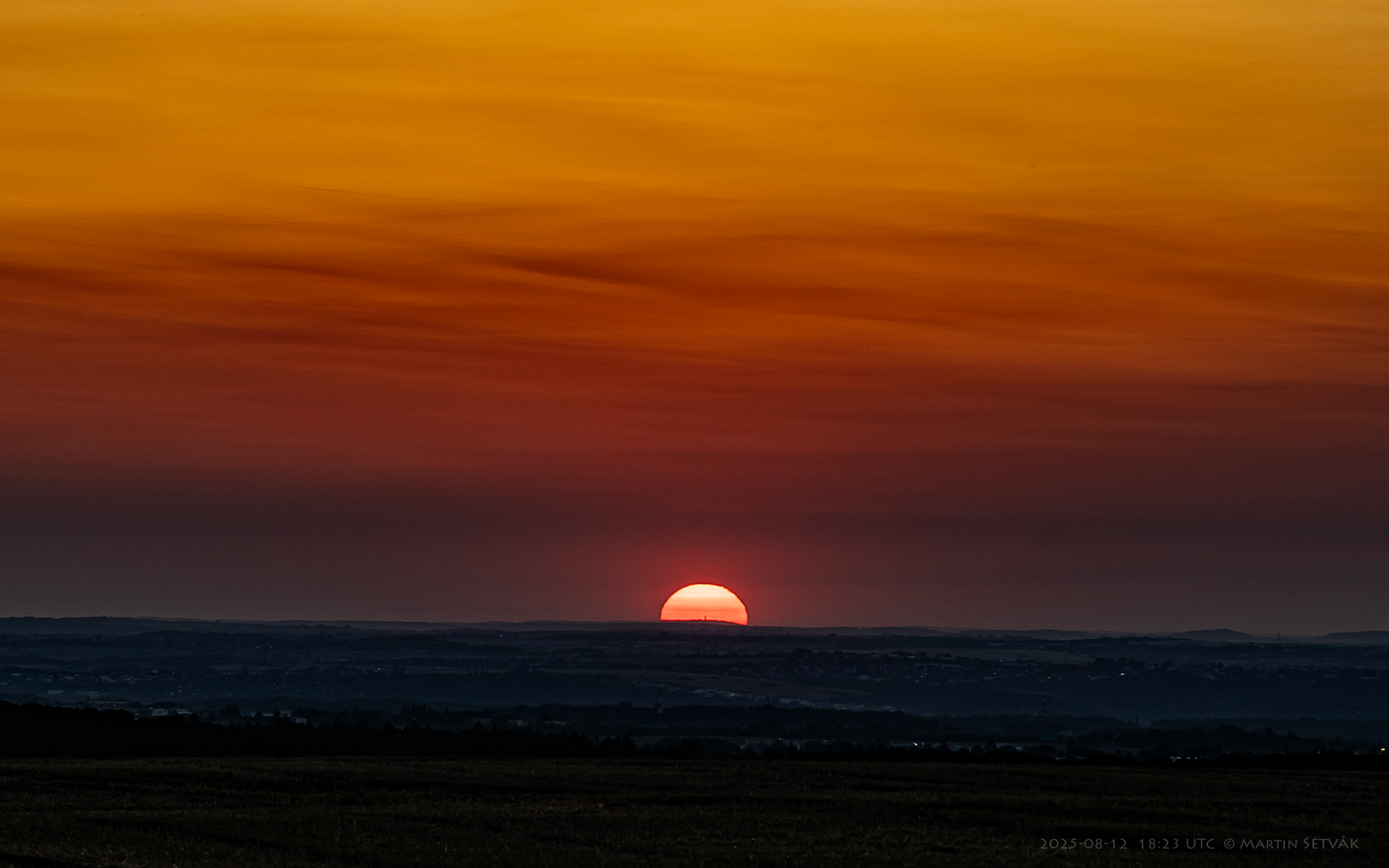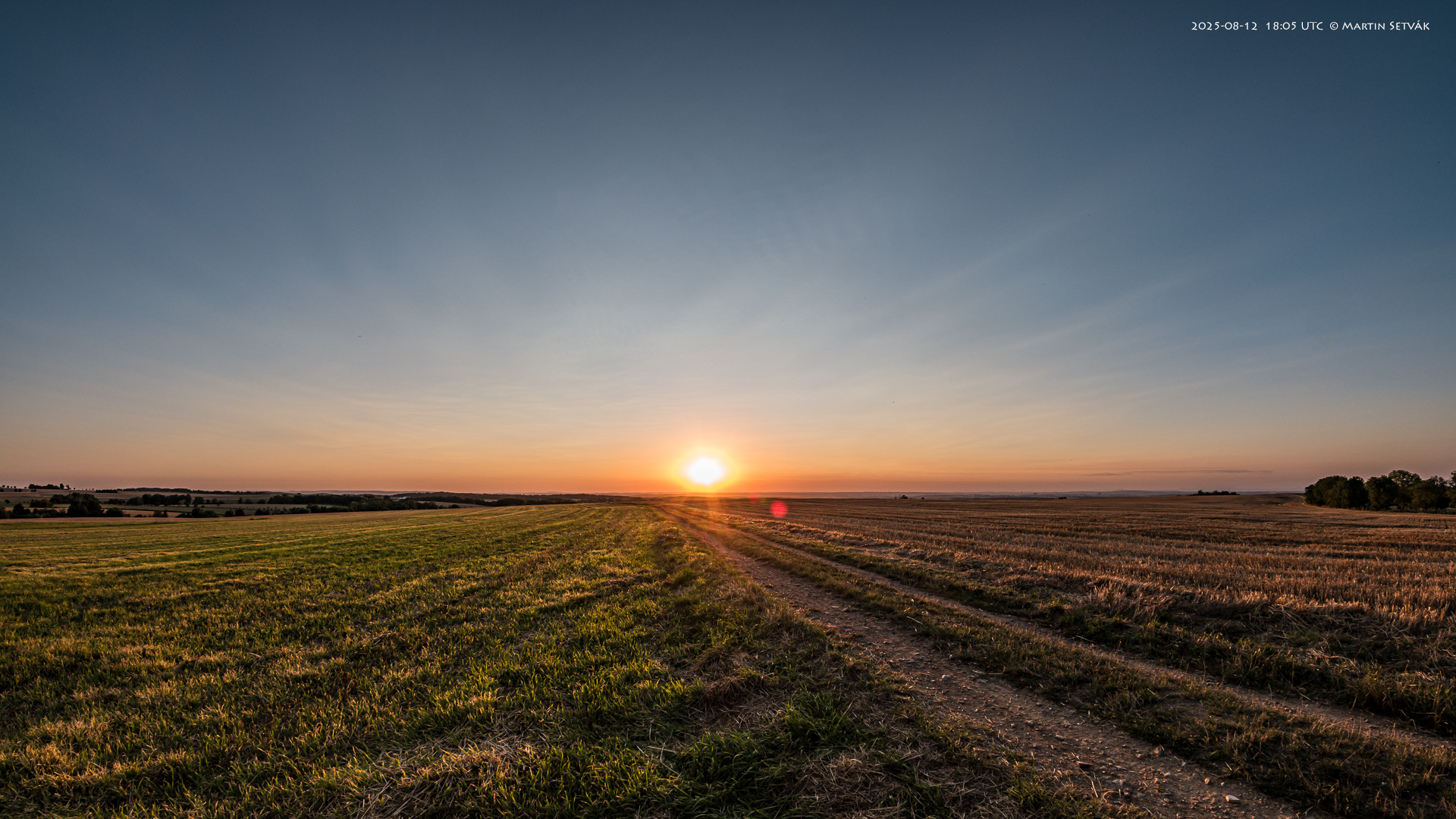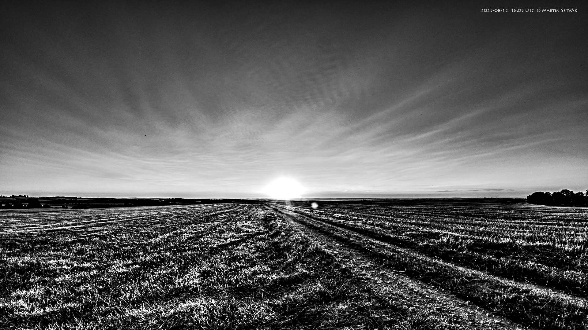 Samsung NX 500 & Samyang 8mm F2.8 UMC Fisheye II, interval 5 seconds, speed 150x 20250812_1739-1836utc_Okrouhlik-sunset_fisheye_rgb.mp4 (33 MB, color version) 20250812_1739-1836utc_Okrouhlik-sunset_fisheye_greyscale.mp4 (33 MB, greyscale version) Ripply dusty sunset. Simultaneously with my timelapse of the sunset behind Klínovec (see above), I used a wide-angle lens on my second camera to record a timelapse of clouds of dust (smoke from Canadian fires) drifting from the west over Czechia. Their structure was interesting – in addition to the distinctive "fibers", faintly visible to the naked eye, smaller ripples formed on the veil of dust, which only stood out in the timelapse movies. The timelapse is processed both in color (with only slight enhancement of the structures) and in black and white, where the structure of the dust stands out very nicely due to the significant suppression of the blue component. See also static images from 18:05 UTC (20:05 CEST) in color and in black and white versions. Taken from Okrouhlík, south of Prague.