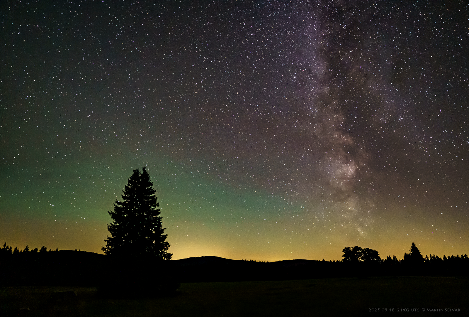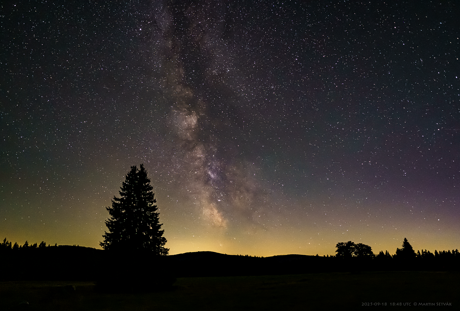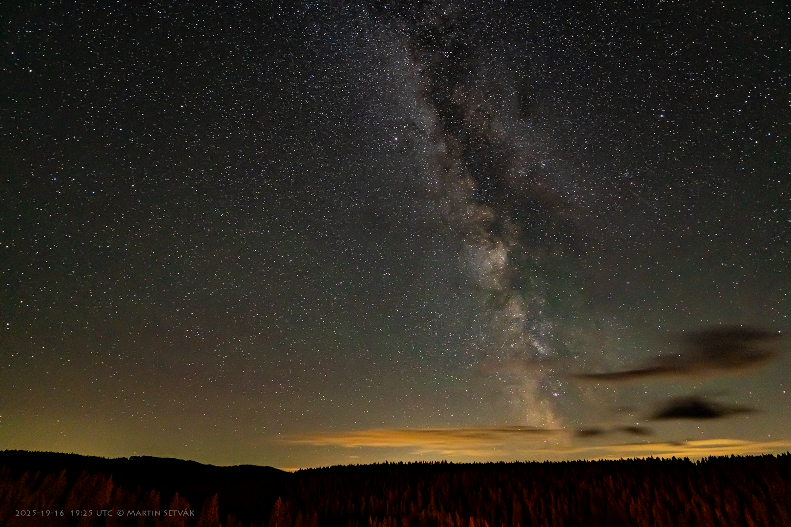 Sony A7C & Sigma 17 mm F4 DG DN Contemporary, interval 20 seconds, speed 600x 20250918_1625-2105utc__MW-Kvilda_x264_1600x1080.mp4 (65 MB) Milky Way and green airglow above Šumava, south Bohemia. Taken from a forest glade above Kvilda (see the orthophoto and position on the map, source Mapy.com), where the lights from Kvilda itself are no longer a big issue, but the light pollution over Germany (towards Passau, source lightpollutionmap.info) is rather strong. The location and angle of the timelapse are marked in red on both images. Compared to the night of September 16, 2025, there was a thicker haze above the horizon, significantly intensifying the glare of the horizon. See also these static photos from 16:26 UTC (18:26 CEST) shortly before sunset, 18:48 UTC (20:48 CEST) shortly after dusk, and 21:02 UTC (23:02 CEST) from the end of the timelapse, both night ones after filtering out airplanes and satellites.