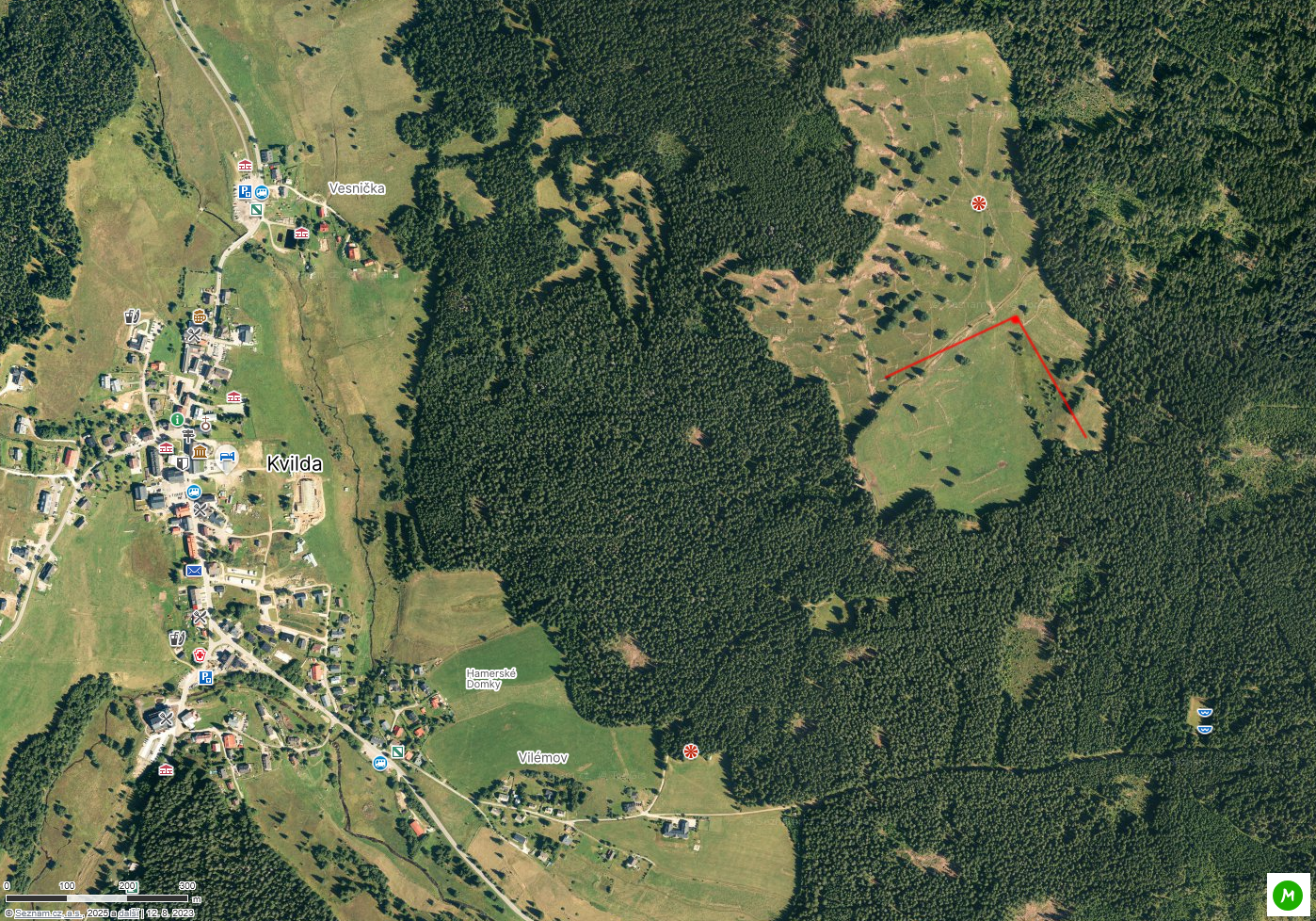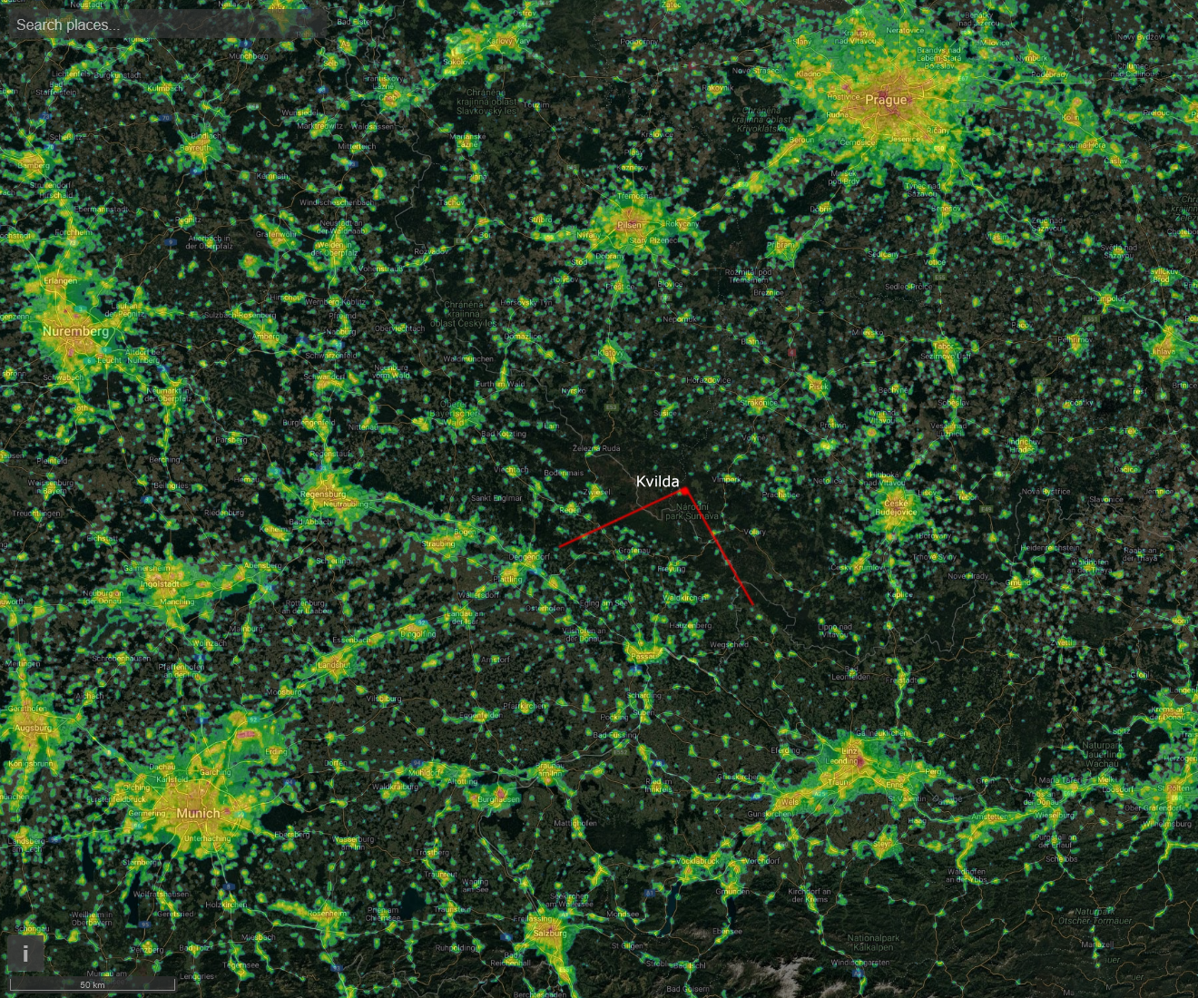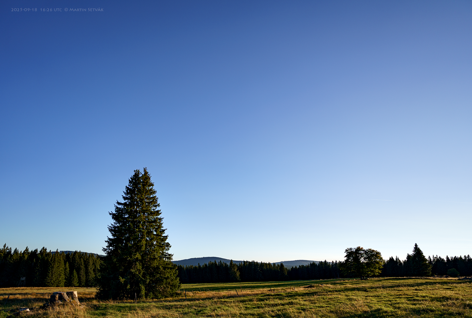 Sony A7C & Sigma 17 mm F4 DG DN Contemporary, interval 20 seconds, speed 600x 20250918_1625-2105utc__MW-Kvilda_x264_1600x1080.mp4 (65 MB) Milky Way and green airglow above Šumava, south Bohemia. Taken from a forest glade above Kvilda (see the orthophoto and position on the map, source Mapy.com), where the lights from Kvilda itself are no longer a big issue, but the light pollution over Germany (towards Passau, source lightpollutionmap.info) is rather strong. The location and angle of the timelapse are marked in red on both images. Compared to the night of September 16, 2025, there was a thicker haze above the horizon, significantly intensifying the glare of the horizon. See also these static photos from 16:26 UTC (18:26 CEST) shortly before sunset, 18:48 UTC (20:48 CEST) shortly after dusk, and 21:02 UTC (23:02 CEST) from the end of the timelapse, both night ones after filtering out airplanes and satellites.