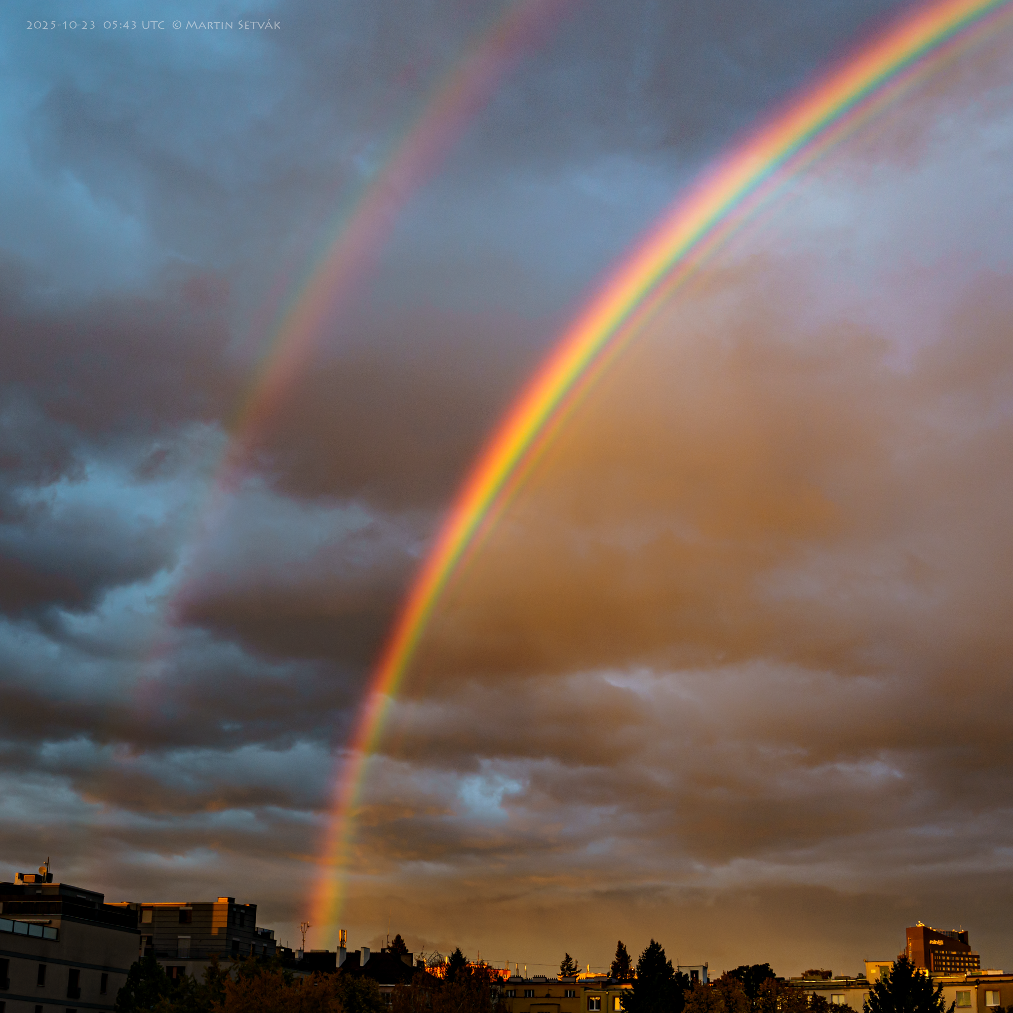 Sony A7C & Sony SEL2860 @ 28mm, interval 1 second, speed: 20x 20251023_0543utc_rainbow_Kacerov_x264_1080x1080.mp4 (25 MB) 20251023_0543utc_rainbow_Kacerov_x265_RGB24_1080x1080.mkv (25 MB, HEVC RGB24) Fine structure of a sunrise rainbow. As can be clearly seen in the beginning of the timelapse or in this larger still photo of the rainbow, in addition to the main rainbow arc and the relatively common weaker secondary arc (outside the main arc), there were also two, possibly three so-called supernumerary bows (or bands), closely adjacent to the main arc from its inner side. For an explanation of these supernumerary bands, see e.g. Wikipedia. The timelapse clearly shows the significant temporal variability of the appearance of both, the main and secondary rainbows, and especially the aforementioned inner supernumerary bands. Unfortunately I missed the beginning of the rainbow, but at least I managed to capture its most beautiful phase, until its disappearance - all within a span of just four minutes. The HEVC RGB24 version of the timelapse is slightly higher quality (in fine details), but probably you will need an external video player to play it (web browsers do not support this format). Location: Prague - Kačerov.