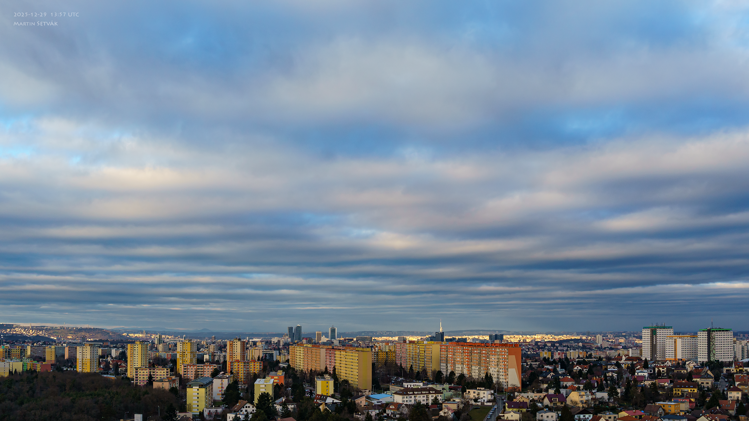 Sony A7C & Sony SEL2860 @ 35mm, interval 5 seconds, speed: 150x 20251229_1330-1500utc_Praha-Libus_x264.mp4 (78 MB) Cloud waves above Czechia, taken from Prague. In this case, I first noticed the beautiful waves in satellite imagery, taken by Meteosat-12 (MTG-I1), and only afterwards in the sky. I recommend playing the satellite image animation (VIS0.6 band at half-kilometer resolution) several times over and over, until you begin to perceive several different groups of waves, generated by different sources and interfeeing with each other. The still images from the satellite (1400utc MTG FCI VIS06) and from the Praha-Libuš ex-radar tower (Sony A7C 13:57 UTC) were taken at almost the same time, around 14:00 UTC (15:00 CET), with the red dot in the satellite image marking the location from where the timelapse was taken. The base of the cloud layer was (above Prague) at altitude of around 1 km, as shown by the noon sounding from Praha- Libuš. Some of the waves are of orographic origin (flow over mountain ridges), while other ones are most likely caused by strong vertical wind shear (a change in direction and speed below and above this cloud layer).